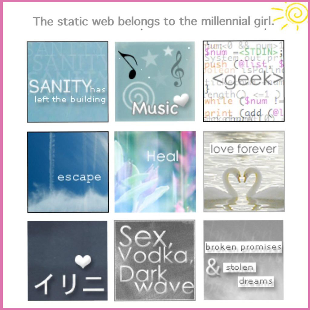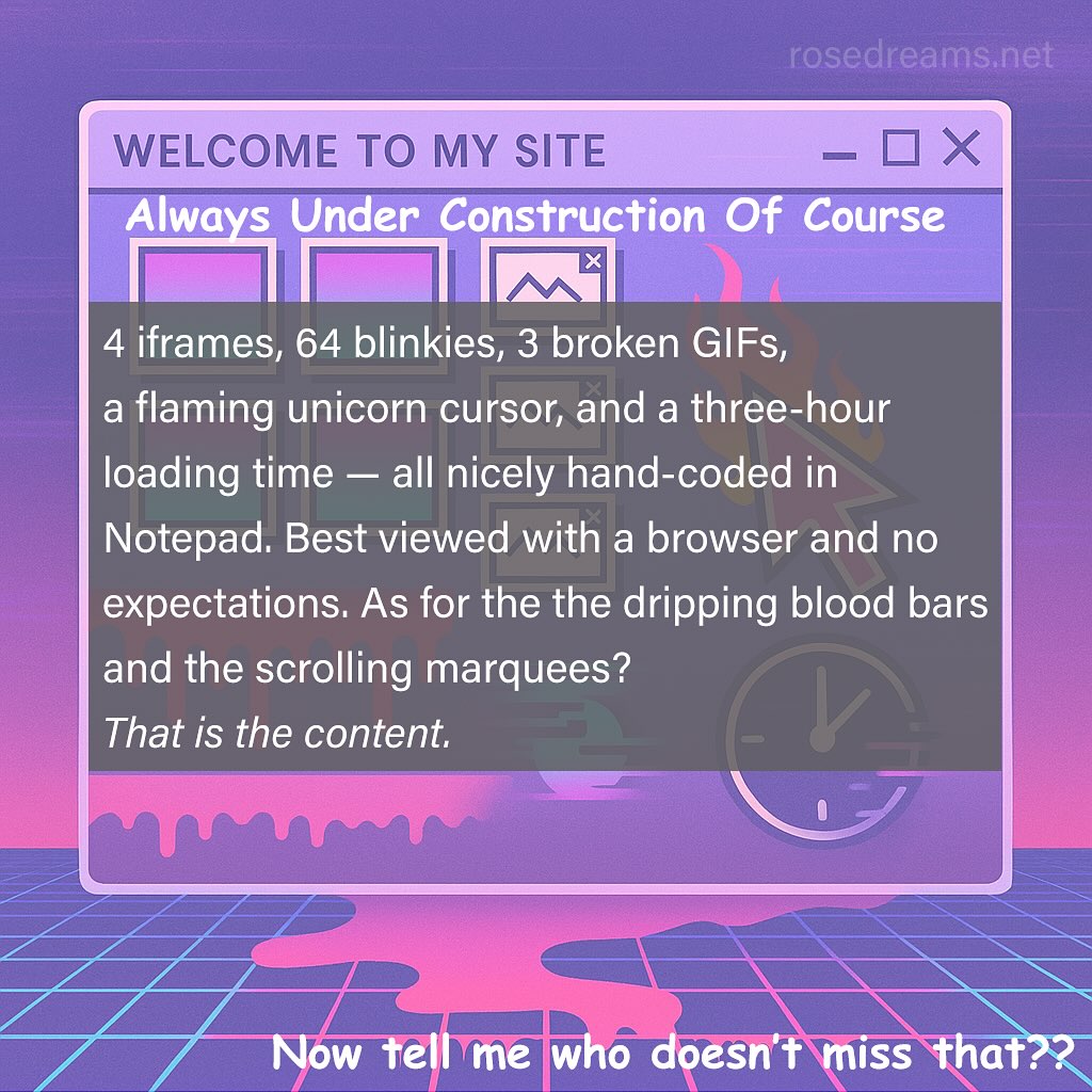 (Don’t tell me you miss this—because if you do, I will unleash Comic Sans upon you: splashed across glitter backgrounds, buried in nesting iframes inside tables, inside more tables, inside frames. Autoplaying MIDI. Hit counters. Dancing, glittering, blood-drop GIFs. A guestbook no one has signed since 2003. I will add cliques. Tagboards. Dolls. Blinkies. Toyboxes. A three-hour loading time. Made in notepad and best viewed with a browser and no expectations.